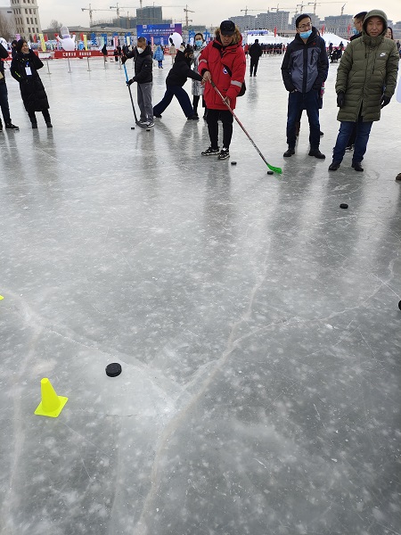 運動會設(shè)置了冰球射擊、雪圈投擲、冰車大作戰(zhàn)、冰壺撞擊、抽冰陀螺5個項目,形式簡單、易于參與、趣味性強。現(xiàn)場,冰壺、冰球射門設(shè)施擺滿了整個場地,職工們躍躍欲試。運動會上,集團公司運動員不懼嚴寒,團結(jié)一致、相互鼓勵,充分享受著運動帶來的樂趣,也在運動中加深了對冰雪運動的熱愛與了解。